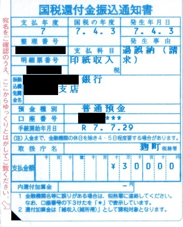 なお、銀行口座を指定した場合については、還付金の振込後、郵送で、「国税還付金振込通知書」(はがき)も税務署から送られてきます。